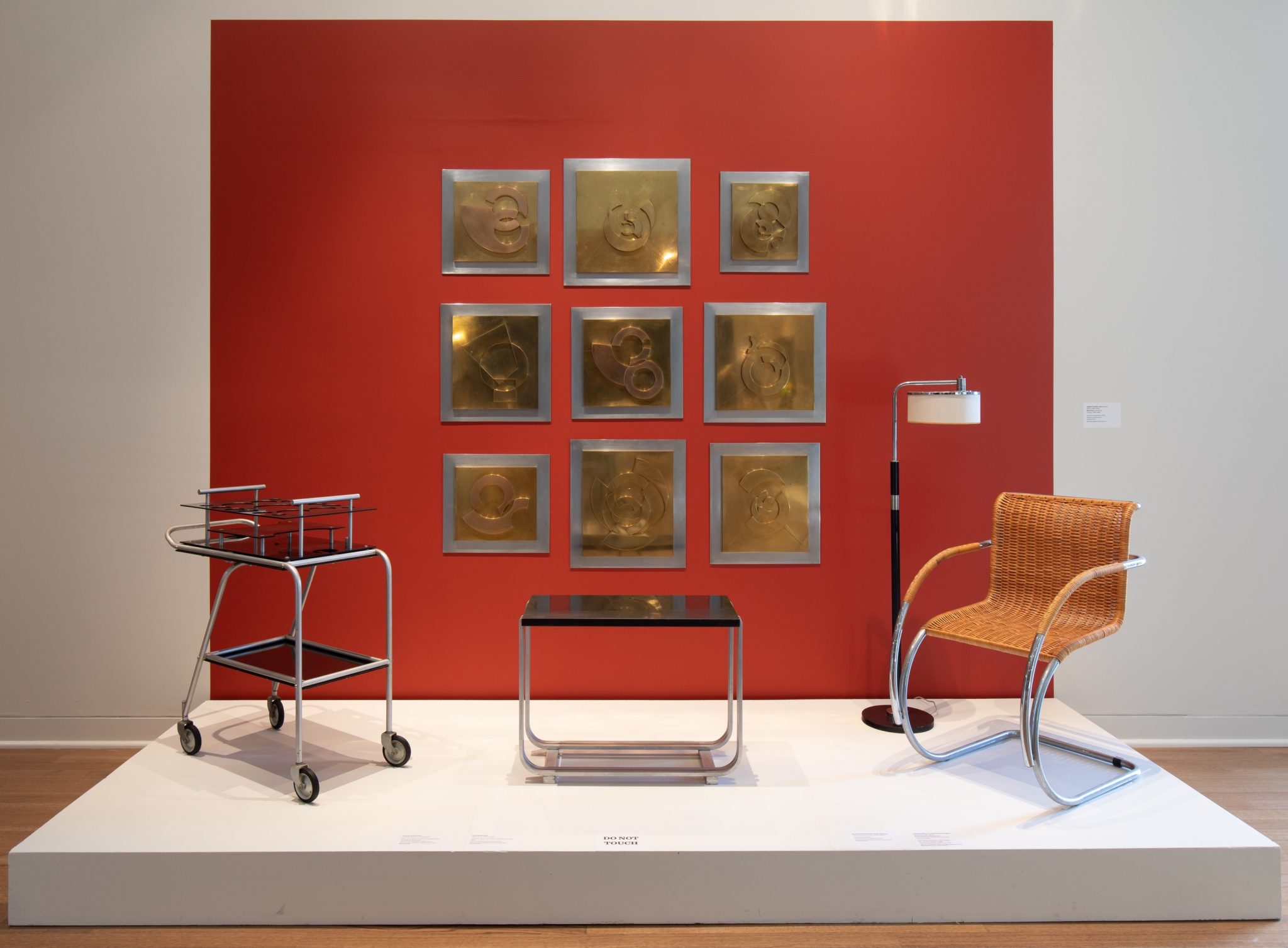 A display in the Lupin Gallery includes an array of twentieth-century decor: Frantz Industries (United States, Los Angeles, California), “Aero-art” Service Cart for DC3 Aircraft, 1938 design, Aluminum, Bakelite, rubber tires, Gift from the collection of Dr. Ronald Swartz and Ellen Johnson, 2018.52 • In style of Fredrick John Keisler (Austrian-American, 1890–1965), Floor lamp, 1930s, Chromed and enameled steel, Loan from the collection of Ellen Johnson and Dr. Ronald Swartz • Ludwig Mies van der Rohe, designer (German, 1886–1969) Knoll International (United States, East Greenville, Pennsylvania, founded 1938), MR Chair with arms, 1927 design, this version made c. 1980, Tubular stainless steel, cane seat, Gift of Dr. Donald R. Wood and John Webster Keefe in memory of Hans H. Lorenz, 99.83 • Sophie Taueber-Arp (Swiss, 1889–1943), Hans Arp, executed by (French, 1889–1966), Derniere Construction, 1942, Bronze, stainless steel, Edition 2 of 3, Gift of Mrs. Edgar B. Stern, 64.14.1–9 • Donald Deskey (American, 1894–1989), Table for Radio City Music Hall (New York), 1932, Chromed metal, lacquered wood, Loan from the collection of Ellen Johnson and Ronald Swartz