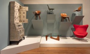 A wall hung with chairs designed by Ray and Charles Eames anchors the Midcentury Modern installation. Here, the rational impulses of Modernism softened in the postwar era to include rounded corners and a more playful sensibility, shown through iconic objects like Russell Wright’s “American Modern” dinnerware and in unique shapes like the timeless ceramics by the potter Katherine Choy, who led the ceramics department at Newcomb College in the mid-1950s.