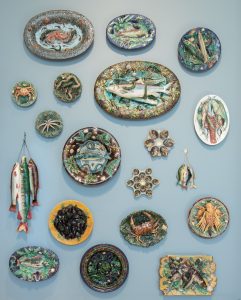 This exuberance is explored with a focus on “rustication,” a style that found popularity in the 1870s. This hyperrealistic ornament is found on famous Haviland plates from the 1879 White House service of President Hayes, which depict flora and fauna native to North America, but also on a mirror by an unknown maker boldly framed with twigs and carved animals. This rustication period includes nineteenth-century “Palissy ware” donated by actress Brooke Hayward Duchin. These ceramics are crawling with realistic molded fish, eels, insects, and shells in the manner of the Renaissance artist/scientist Bernard Palissy.